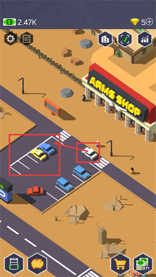 1、找到【ARMS-SHOP】旁的停车场区域,确认当前车位的车辆停放状态,为后续的停车场升级操作做前置准备。
