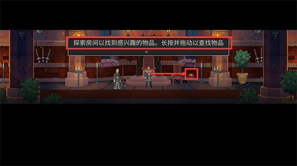 1、按提示【探索房间以找到感兴趣的物品。长按并拖动以查找物品】操作,拖动画面可探索房间内的目标物品,推进流程。
