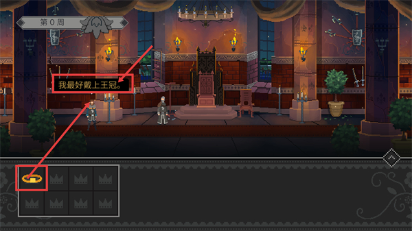 2、在【第0周】场景中,根据指引选择下方的【王冠】道具,为角色佩戴,完成当前步骤的剧情交互要求。