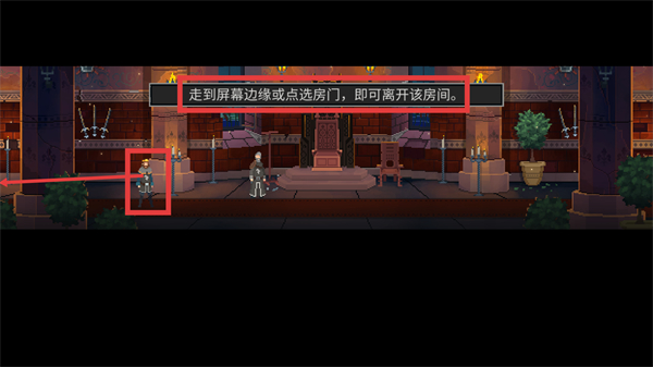 4、按提示【走到屏幕边缘或点选房门,即可离开该房间】,操控角色移动到屏幕边缘,即可退出当前房间进入下一场景。