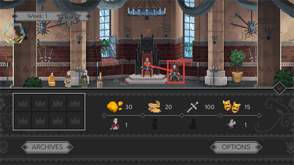 1、在【Week:1】的场景中,关注界面显示的资源数值(如【30】金币、【20】物资等),后续可通过交互NPC推进剧情。