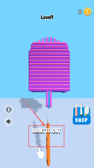 1、进入游戏:首先打开游戏主界面,点击“DRAG TO CUT”进入第一关。