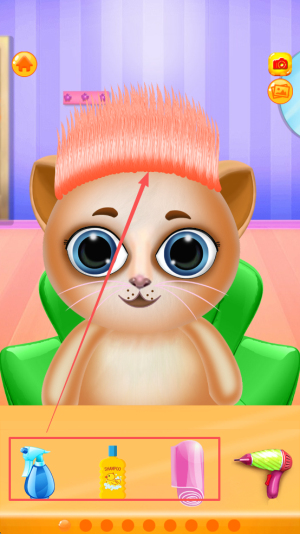 3、开始游戏:在沙龙界面查看目标发型,使用剪刀、梳子等工具为猫咪造型。