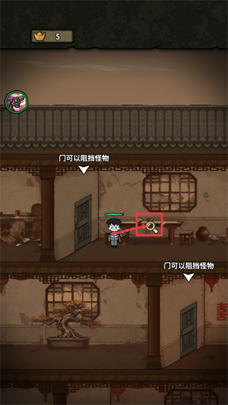 2、利用【门可以阻挡怪物】的机制规避危险,同时跟随指引点击【放大镜】标识,获取场景内的道具。