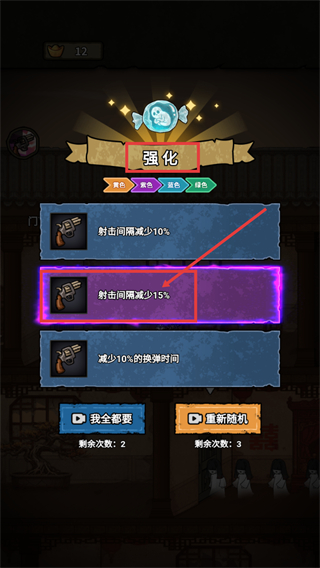 3、在【强化】界面优先选择增益更高的选项,如【射击间隔减少15%】,提升战斗效率以应对后续威胁。