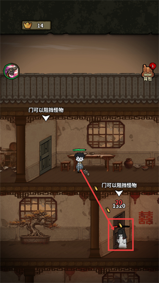 4、面对怪物时借助门的阻挡效果,攻击目标获取【20-1320】类资源,同时留意【背包】的道具使用时机。