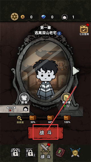 1、在【第一章-逃离深山老宅】界面,点击【战斗】按钮进入关卡,同时可查看【幸存者-0/6】进度,推进探索度解锁奖励。