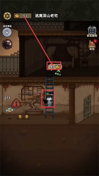 2、在场景中操控角色攀爬梯子,获取【45-金币】资源,留意【撤离点】位置,为后续脱离危险做准备。