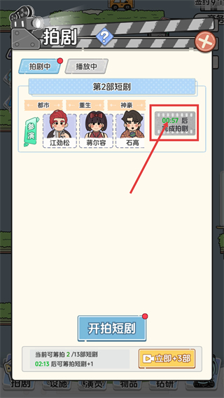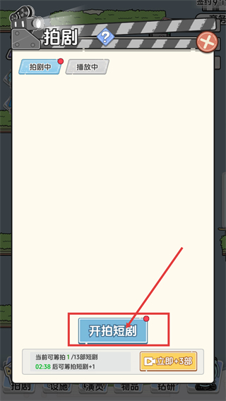 1、在【拍剧】界面点击【开拍短剧】按钮启动拍摄,注意当前可筹拍数量为【1/13部短剧】,等待冷却时间积累次数。