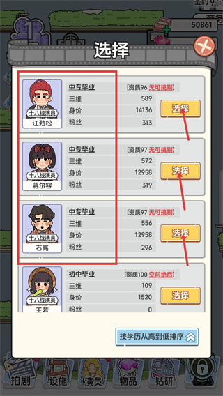 3、在演员选择界面,优先挑选【资质】较高的演员(如江劲松-96),点击【选择】按钮确定参演人员。