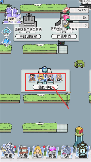 1、点击【签约中心】进入演员签约界面,可解锁如【声效训练室】等设施,需积累签约演员数量来解锁更多功能。