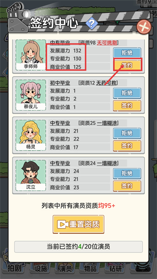 2、在【签约中心】优先选择【资质-98】等高属性演员(如李师师),点击【签约】按钮,提升已签约演员的质量。