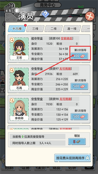 4、安排多名演员同时接受指导,等待指导倒计时(如00:23)结束,即可完成属性提升,增强演员实力。