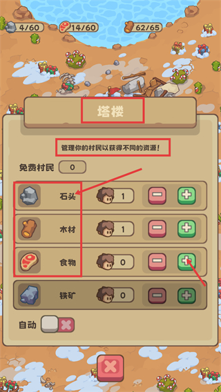 1、进入【塔楼】界面,管理村民可获取资源,通过分配村民至【石头】【木材】等项,积累对应物资,注意【食物】类资源需及时补充。