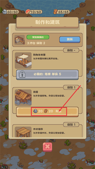 3、打开【制作和建筑】界面,先消耗20金币解锁【房屋】,提升储物容量,后续需达成【塔楼-等级5】解锁更多建筑。