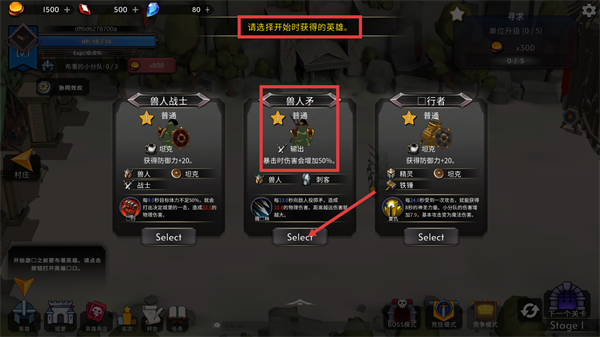 1、初始选择英雄时,【兽人矛】属于输出型,暴击伤害增50%,适合主打输出的阵容搭配,点击【Select】即可选定。