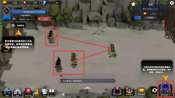 2、部署小队时,可拖动英雄调整位置,激活【协同效应】能强化英雄属性,配置完后点击【下一个关卡】进入战斗。