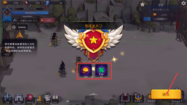 4、完成关卡后会获得【150金币】与【25Exp】奖励,点击【确认】领取,助力后续英雄升级与资源积累。