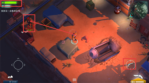 3、遇到敌人时,使用右侧【瞄准】按钮调整方向并射击,清除障碍后继续寻找另一【应急供应包】。