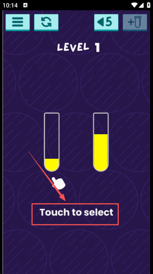 3、开始游戏:在关卡界面查看水量目标,点击“Touch to pour water”倾倒液体。