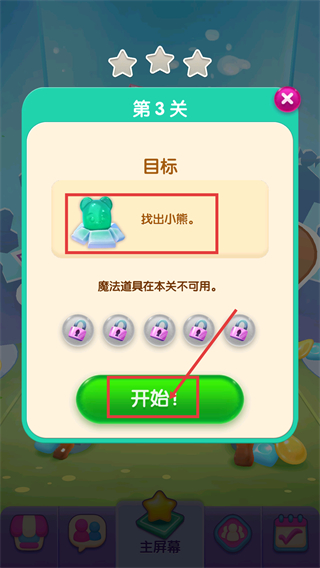 1、确认关卡目标为【找出小熊】后,点击【开始】按钮进入第3关的消除场景,推进挑战。