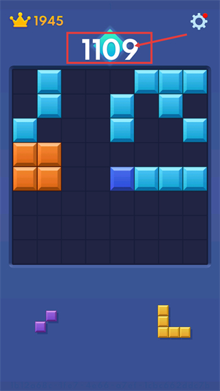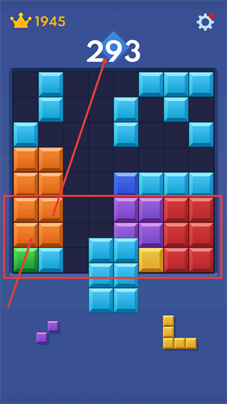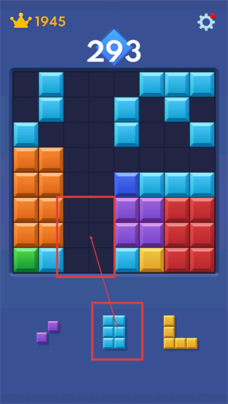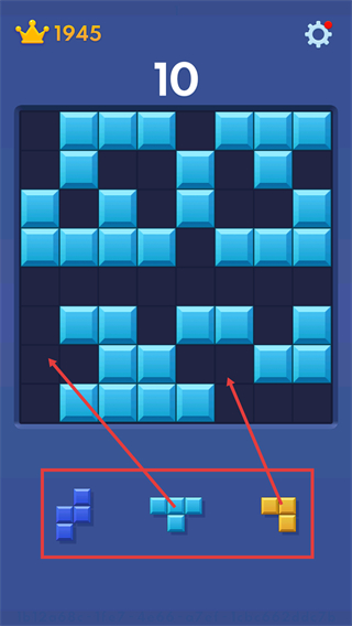 1、观察界面底部的方块样式,将对应形状的方块拖入上方网格的空缺处,匹配后可消除方块并积累【1945】皇冠数值。