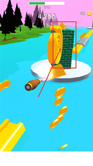 3、将切削后的木板推向【绿色砖墙】,完成当前阶段目标,此时数值暂变为【4288】,同时可继续收集掉落的金币。