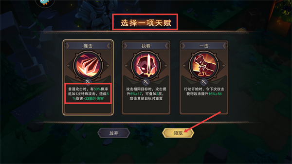 2、面对【选择一项天赋】界面,可选【连击】【抗袭】【一击】,选后点击【领取】来获取对应天赋加成,提升战斗能力。