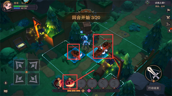 1、进入回合开始-3/20界面后,关注【状态-玛奇】数值,利用下方技能栏操作,完成行动后点击【行动结束】推进流程。