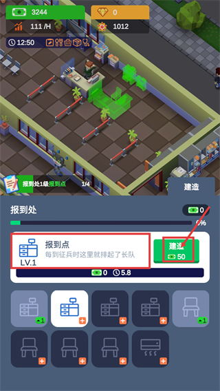2、进入报到处建造界面后,选择【报到点-LV.1】,消耗50货币点击【建造】按钮,即可完成该设施的部署。