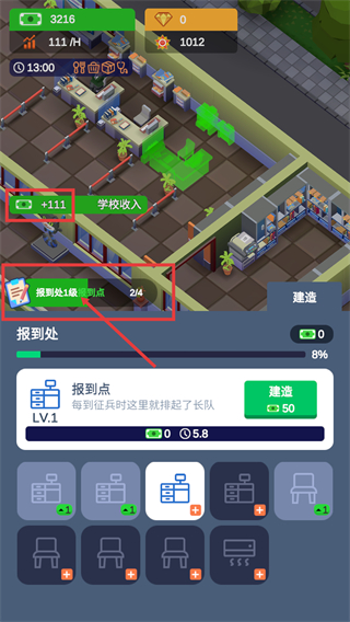 3、建造后可获得【学校收入-+111】,同时【报到处1级报到点】进度更新为2/4,持续推进可解锁更多设施。