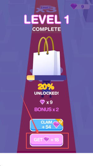 4、领取奖励:当界面显示“LEVEL COMPLETE”,点击“CLAIM”领取双倍奖励进入下一关。
