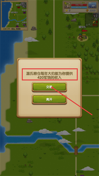 2、与【温氏粮仓】交互后,会显示其每年提供【420军饷】的收益,点击【交易】按钮即可进入物品交易界面,兑换所需物资。