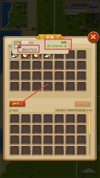 4、选择【稻草-x36】这类物品,其可【增加士气1点】,购入价格为【106】金币,按需购入能提升部队状态。