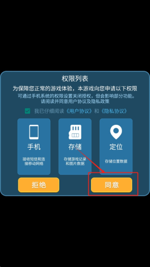 1、授权登录:打开游戏后阅读权限说明,勾选协议并点击“同意”完成授权。
