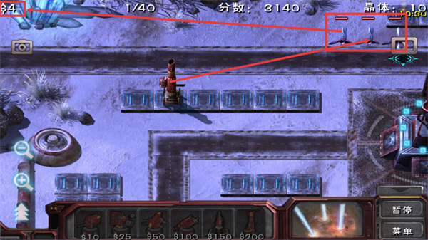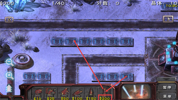 1、开局拥有$200资金,优先选择$200级炮塔,放置在路径关键节点,覆盖敌方行进路线,为后续防御奠基。