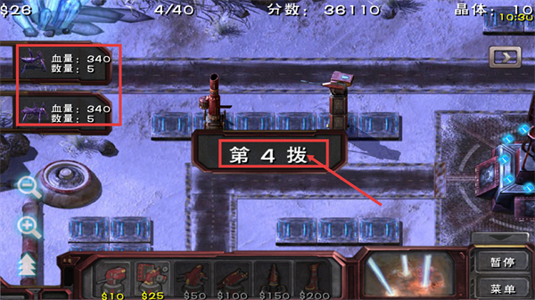 4、第4拨敌方为【血量:340-数量:5】的高血单位,需升级现有炮塔,增强单次伤害,确保有效拦截。