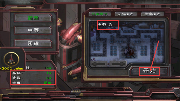 1、选择【任务3】后点击【开始】,先确认【简单】难度,开局持有【2000-coins】-钱、【10】-晶体等资源,做好战前准备。