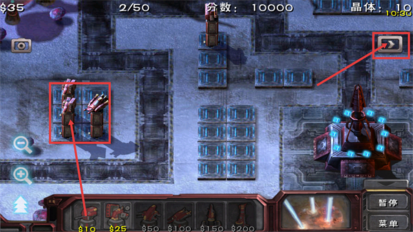 2、消耗【10】-钱部署防御塔,留意右上角【晶体-10】,通过建造塔防积累【10000】-分数,同时关注资源数值变化。