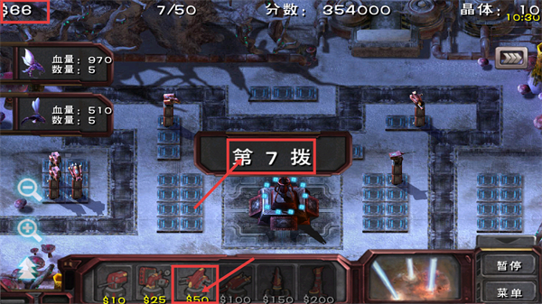4、应对【第7拨】敌人,查看敌方【血量-970】等属性,消耗【850】-资金强化塔防,持续积累【354000】-分数推进关卡。