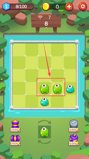 3、继续合成:当进度升至“8/100”,分数仍1000,保持操作直至怪物升级。