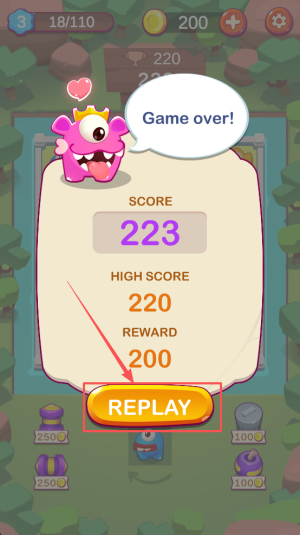 4、结束领奖:进度达“18/110”出现“Game over!”,领取“REWARD 200”后按“REPLAY”再开一局。