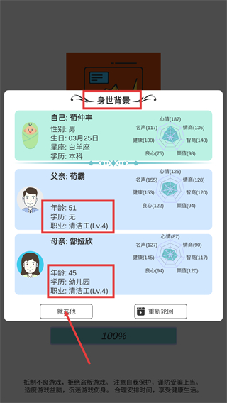 1、查看【身世背景】信息,确认自身及父母的年龄、学历、职业等属性,点击【就选他】进入游戏进程。