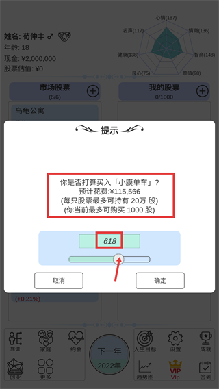 3、面对【是否打算买入「小膜单车」?】的提示,调整持股数量(如选【618】),确认花费后完成买入。