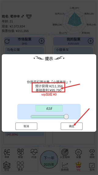 4、在股票升值后,选择出售【小膜单车】,获取【预计获得-¥211,356】的收益,实现资产增值。
