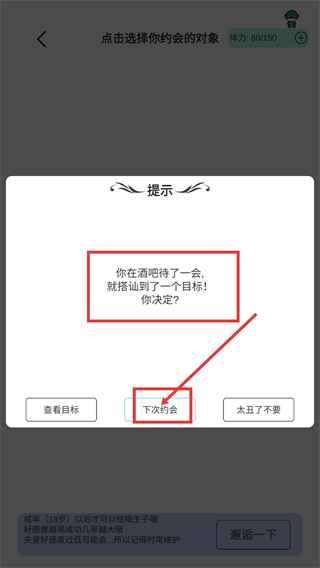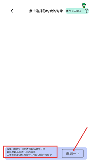 1、注意【成年(18岁)以后才可以结婚生子哦】的提示,点击【邂逅一下】开启约会流程,后续需维护好感度。