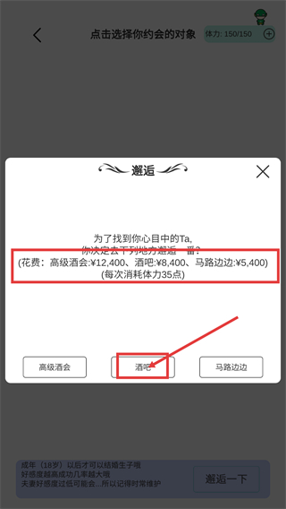 2、选择【酒吧】进行邂逅,需花费【¥8,400】并消耗【35点】体力,根据自身资源选择合适的邂逅场所。