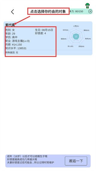 4、查看约会对象【郭代柔】的属性,包括【职业-游戏主播(Lv.9)】【好感度-4】等信息,后续可通过互动提升好感。