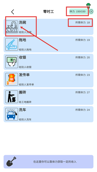 2、选择【洗碗】临时工任务,消耗【18】-体力即可参与,根据自身体力【150/150】合理选择任务类型。