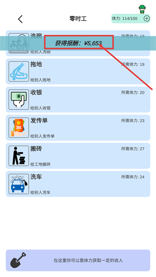 3、完成【洗碗】任务后,可获得【¥5,653】-报酬,积累资金用于后续的属性提升或其他操作。